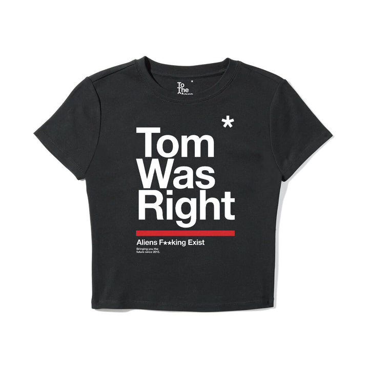 The TTS* Tom Was Right Women's Baby Tee is a 100% cotton, true to size, semi-cropped baby tee with side seams which features the Tom Was Right logo on the chest. We recommend sizing-up for a relaxed fit.