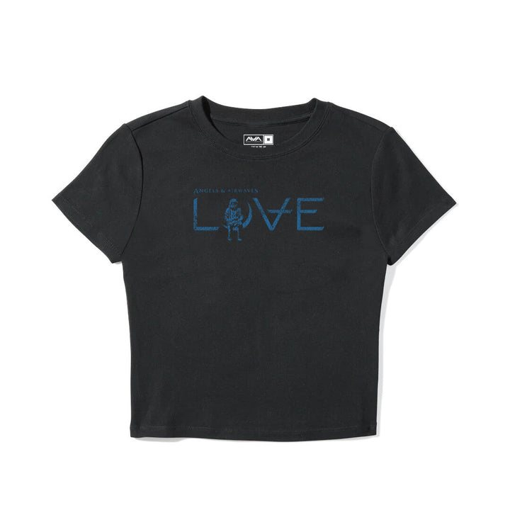 The AVA Love Distressed Women's Baby Tee is a 100% cotton, true to size, semi-cropped baby tee with side seams and features the Love logo on the front. We recommend sizing-up for a relaxed fit.