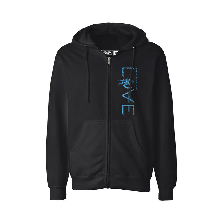 The Angels And Airwaves Love Movie Distressed Zip-Up Hoodie in black is made with soft, midweight fleece and generous fit for comfort. Features jersey lined hood, heavy gauge drawcord with metal eyelets, #5 metal kissing zipper and 1x1 ribbing at cuffs and waistband.