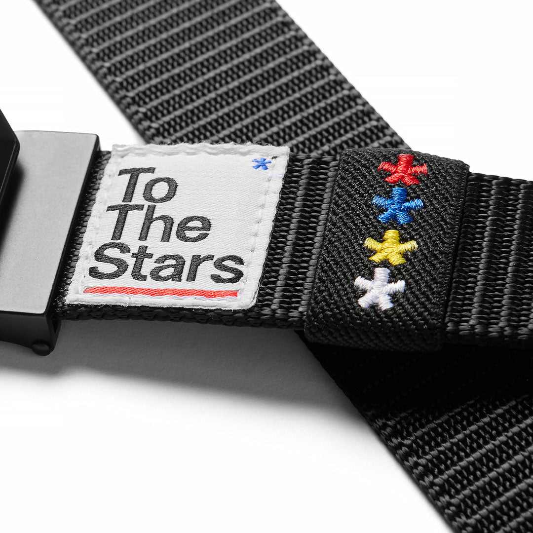 The TTS* Asterisk Ratchet Belt is a black nylon quick-release ratchet belt with an alloy buckle featuring a red asterisk embroidered at the end.