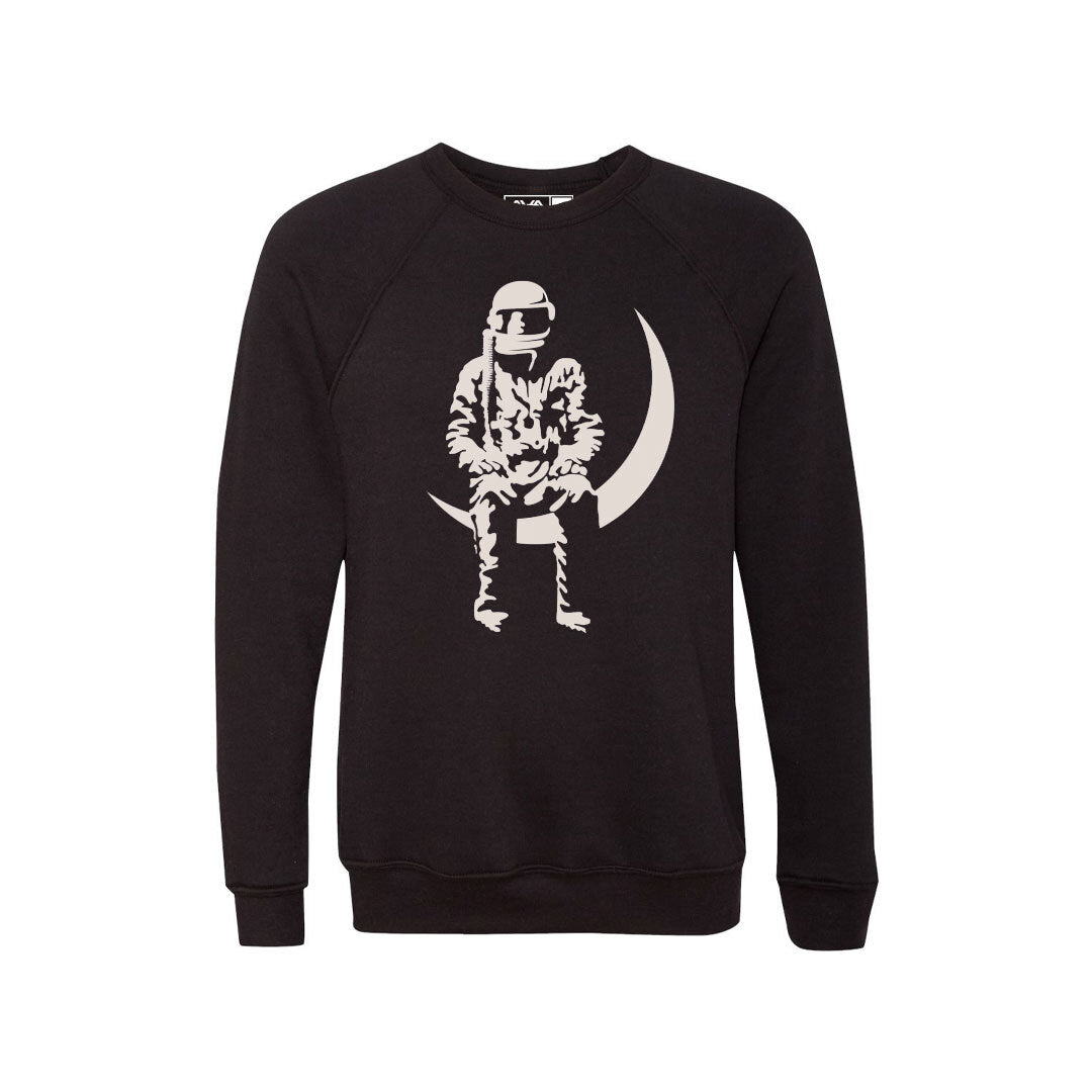 The Angels and Airwaves Moon Man Crewneck Sweatshirt comes in a black sweatshirt with warm grey screen printed Angels and Airwaves Moon Man logo. This midweight crewneck sweatshirt is good for all season and incredibly soft.