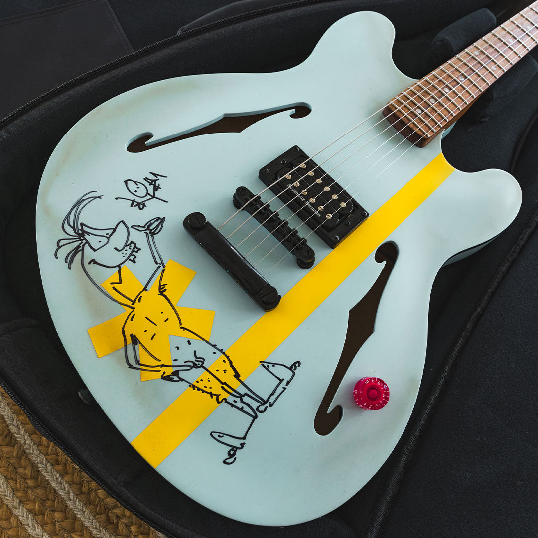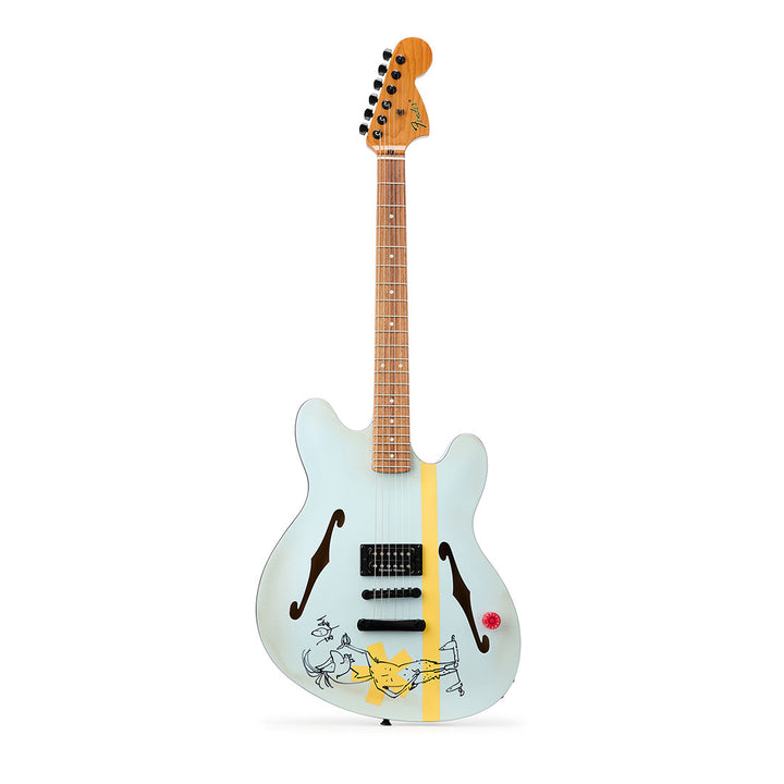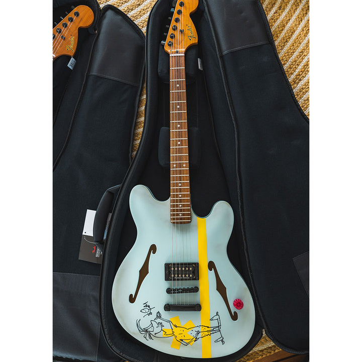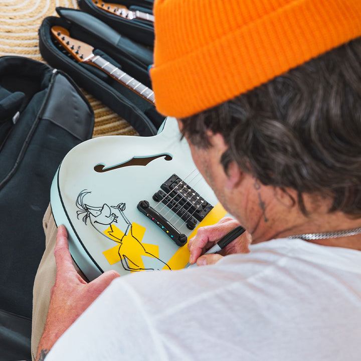 Every guitar features a signature red acrylic “To The Stars” knob, a hand-sanded satin neck back, and—most notably—an individual one-of-one hand-drawn cartoon and signature by Tom DeLonge, illustrated directly on the instrument. No two guitars share the same artwork.