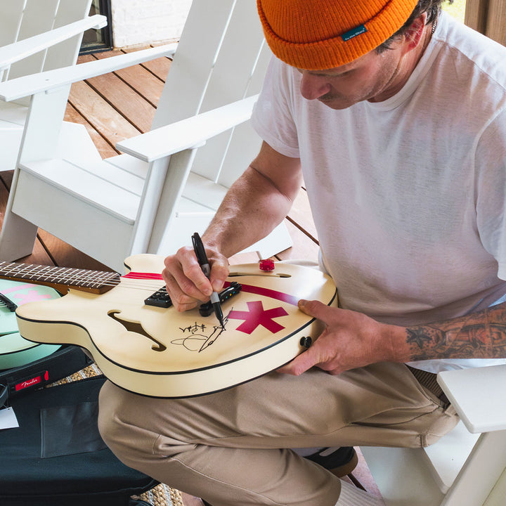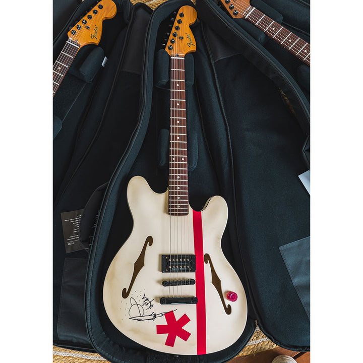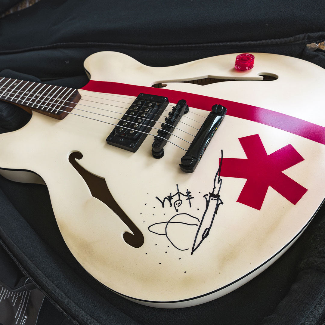 Every guitar features a signature red acrylic “To The Stars” knob, a hand-sanded satin neck back, and—most notably—an individual one-of-one hand-drawn cartoon and signature by Tom DeLonge, illustrated directly on the instrument. No two guitars share the same artwork.